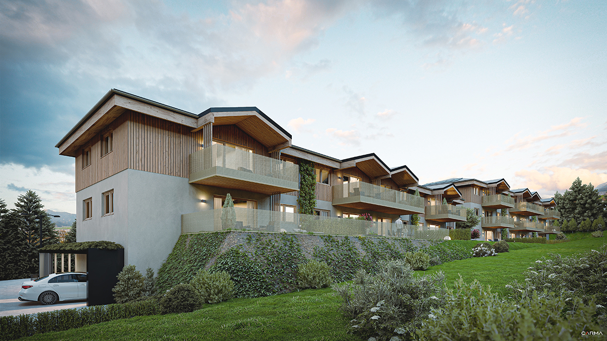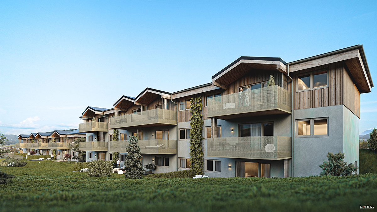 In Nußdorf am Haunsberg entstehen 18 klimaschonende und behagliche Eigentumswohnungen aus Massivholz von ca. 43 bis 92 m2. Die nachhaltig gebauten Wohnungen der beiden mehrgeschossigen Vollholz-Baukörper sind durch ein freiliegendes Treppenhaus verbunden und besitzen jeweils Eigengärten, Terrassen oder Balkone.