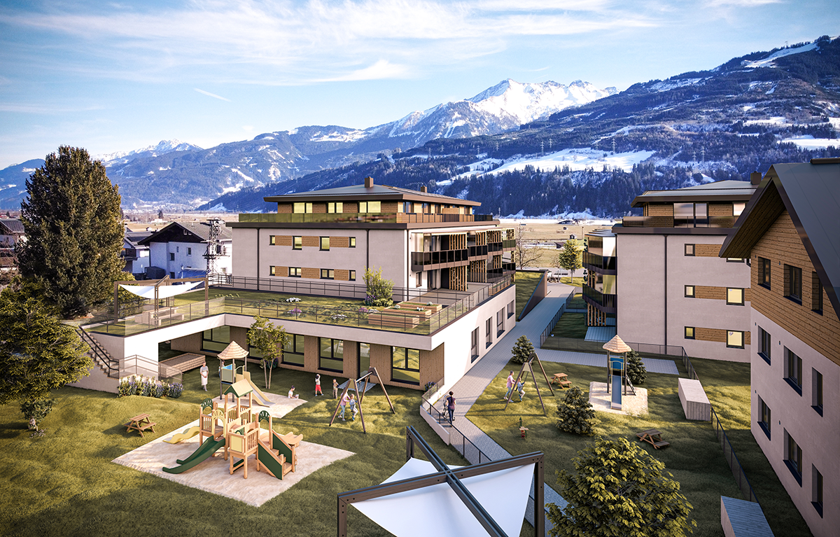 In Piesendorf wird eine einzigartige Wohnanlage mit 53 Wohnungen aus Vollholz gebaut mit einer integrierten Kinderbetreuungseinrichtung für 5 Gruppen errichtet. Als junge Familie oder werdende Eltern können Sie Ihre Kinder direkt vor Ort betreuen lassen und haben so die Gewissheit, dass sich Ihr Nachwuchs in sicheren und angenehmen Räumlichkeiten betreut wird.
